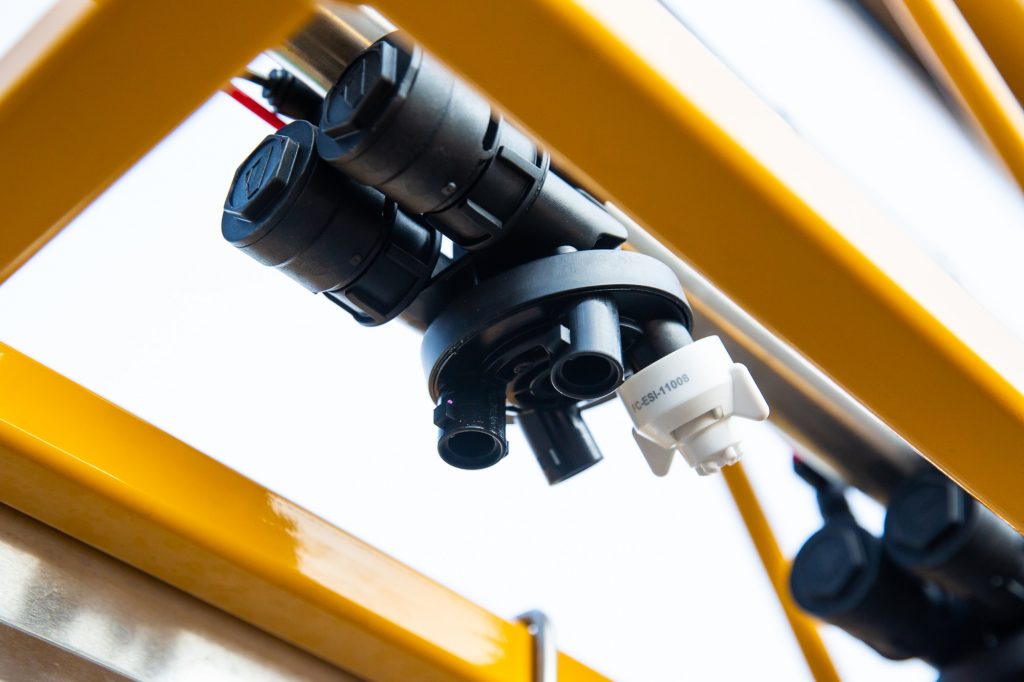 Another twin line option is the Arag Sele-Jet 2+2, allowing up to two of the four turret to be operated from the cab at any one time. Popular setups include two spray jets and two fertiliser nozzles, allowing rate change options either automatically or manually from the cab.
