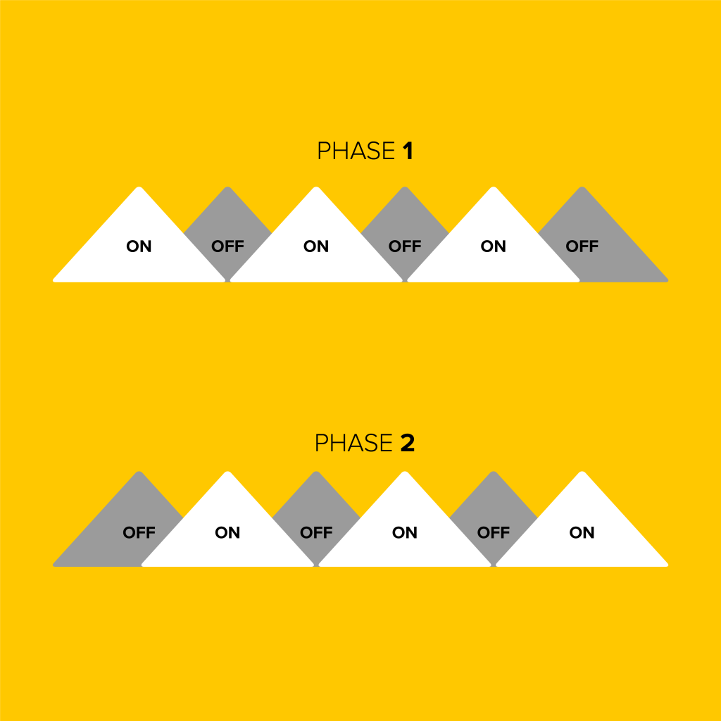 Pulse Width Modulation (PWM) offers solutions to these issues and whilst increasing spray efficacy at the same time. On a PWM system each nozzle body is fitted with an electric solenoid that pulses the spray on and off multiple times a second, this can be anywhere between 10-40Hz (pulses per second). Rate changes are achieved by varying the duration the nozzle is in the “on” position or “duty cycle”. This duty cycle is changed in relation to changes in forward speed, allowing instant rate control at each spray nozzle, with the pressure being fixed at all times to give a consistent droplet size across the whole field.